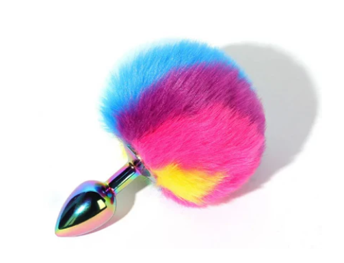 Plug anal metálico tornasol con cola de conejo, color arcoíris, perfecto para un juego de roles y fetichismo.