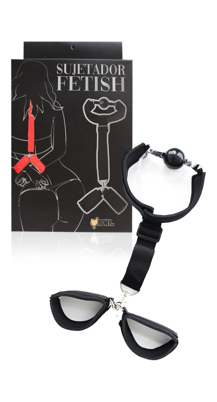 Inmovilizador de manos, se sujeta al cuello y trae mordaza (ball gag) ideal para practicantes BDSM.